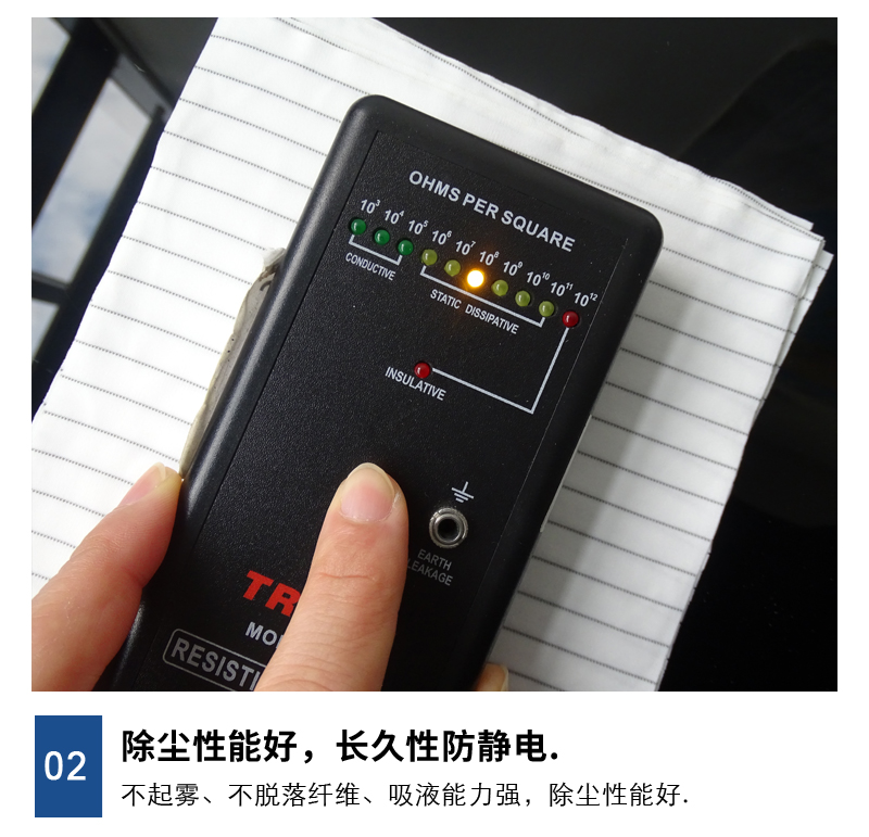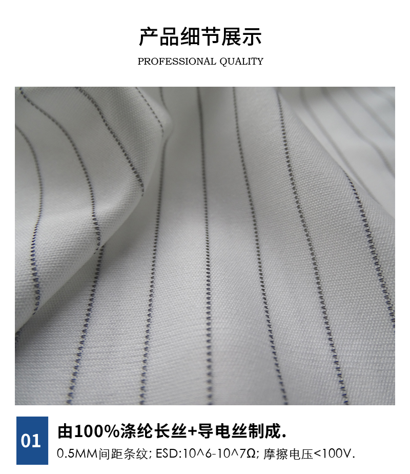由100%涤纶长丝+导电丝制成,0.5MM间距条纹; ESD:10^6-10^7Ω; 克重:125gsm; 摩擦电压<100V